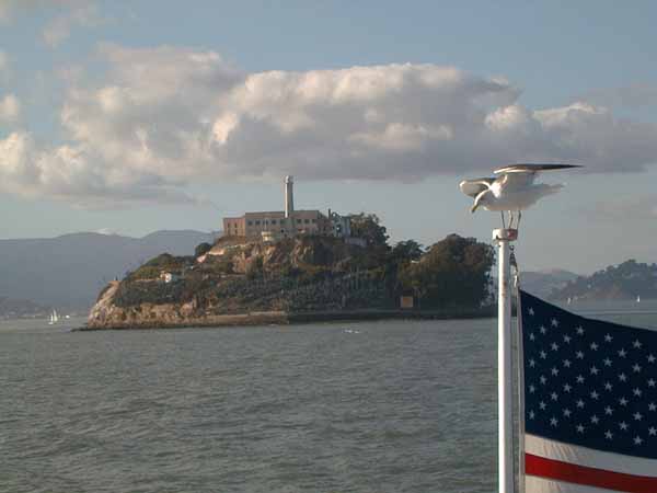 Alcatraz. San Francisco's kjente fengsel. Brukes i dag som turistattraksjon. Det gule bygget på toppen var selve fengslet. Til venstre for fengslet ser du vanntårnet. Rett under vanntårnet ligger vaskeriet. Vaktene bodde på andre siden. Der var ansatt 1 vakt pr 3 fanger! |